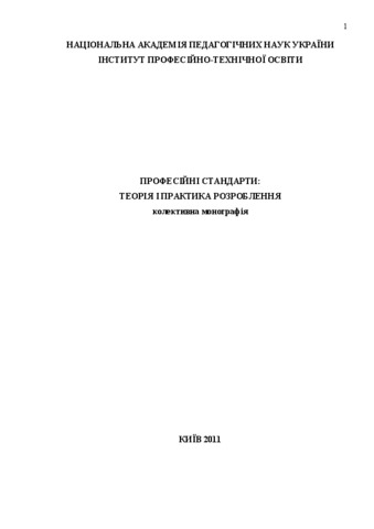 Presented collective monograph contains information on domestic and foreign experience developing professional standards. Created by leading scientists in the field of vocational education and training, adult education, human resource management, book covers conceptual approaches to the development of professional standards as the basis of standards of vocational education. The book is intended for professional and technical workers schools profesioznavstva specialists, teachers, employers.
