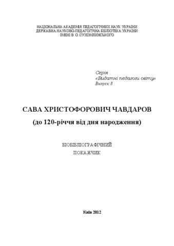 The 8th issue of biobibliographical index within the series “Prominent Teachers of the World” is dedicated to S. Kh. Chavdarov, who is Ukrainian scientist, teacher, specialist in didactics, methodologist in primary and high education, corresponding member of APS of RSFSR, Honoured Scientist of USSR, teacher of Ukrainian and Russian languages in Kyiv region schools, teacher of pedagogics, history of pedagogics, methodology of Ukrainian and Russian languages in Kyiv State University named after T. Shevchenko, director of the Ukrainian Research Institute of Pedagogics (URIP), author of more than 200 scientific works, including works in history of pedagogical idea in Ukraine, textbooks in pedagogics, methodical manuals and textbooks in Ukrainian language for primary and high schools. Bibliography of S. Kh. Chavdarov’s works and researches about his life and activity published during 1927–2012 (507 bibliographic records) is represented in this index. The index is addressed to the scientists, doctoral candidates, graduate students, teachers of higher education establishments, students and those, who are interested in S. Kh. Chavdarov’s scientific and pedagogical heritage.
