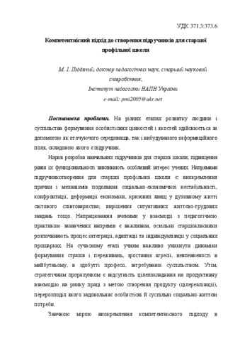 - Піддячий, Микола Іванович (orcid.org/0000-0001-6571-1450) (2012) Competence approach to textbooks for senior high school profile Проблеми сучасного підручника (12). pp. 80-89.