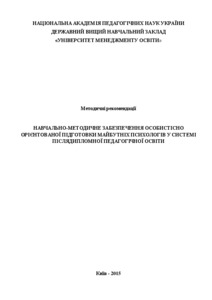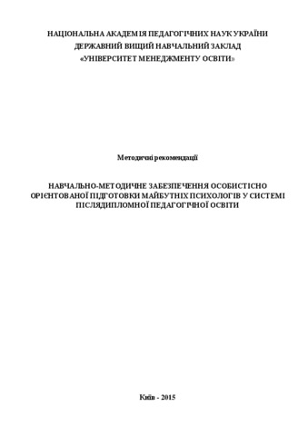 Methodological guidelines include working with a number of curriculum subjects taught in the psychological training of future psychologists in the system of postgraduate education, guidelines for training, guidelines for writing diploma qualification (BA and MA). The main objective of guidelines is vidnadhodzhennya ways to improve the training of future psychologists in the context of student-centered approach. Basic principles of methodological recommendations are personal orientation dilnisnyy approach polidystsyplinarnist. Guidelines for student psychologists, researchers, teachers, students of Postgraduate education.