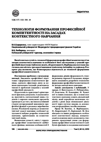 - Сидоренко, Віктор Костянтинович and Любарець, Владислава Вікторівна (2013) Technology of forming professional competence of future tour agents on the basis of the context study Біоресурси і природокористування, 1-2 (5). pp. 136-145. ISSN 2078-9912