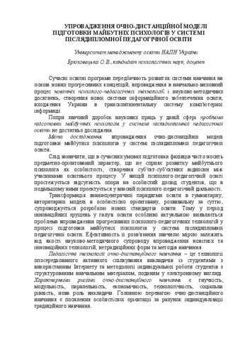 - Брюховецька, О. В. (2014) The introduction of the blended model of training future psychologists in the system of postgraduate education In: Психолого-педагогічне забезпечення модернізації післядипломної педагогічної освіти в умовах змін: всеукр. наук. практ. інтернет-конф . Державний вищий навчальний заклада "Університет менеджменту освіти" НАПН України, м. Київ, м. Донецьк, Україна.