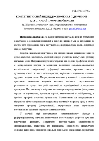 - Піддячий, Микола Іванович (2012) Компетентнісний підхід до створення підручників для старшої профільної школи Проблеми сучасного підручника (12). pp. 189-193. ISSN ISBN 978-966-644-382-6