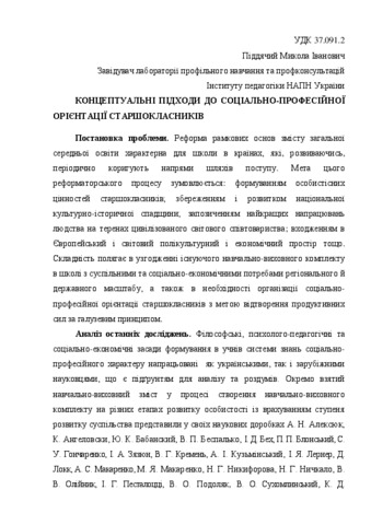 - Піддячий, Микола Іванович (2012) Conceptual approaches to social and vocational guidance Теорія та методика управління освітою (9). pp. 189-193. ISSN 2310-2411