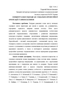 The problems of social and vocational counseling high school students; conservation and development of social and vocational oriented education and educational space; coordination of education and educational space of social and socio-economic orientation; vybudovy educational kit for high school and its frequency adjustment depending on the direction and pace of development; prioritization of basic and specialized knowledge and skills in order to develop competencies; Drawing the best developments towards socio-profeiynoyi orientation; adaptation in European and global multicultural educational environment.