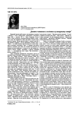 - Рубан, Алла Іванівна (orcid.org/0000-0003-4328-2928) (2012) Children's reading in the educational and cultural dimension Вісник Книжкової палати, 5 (190). pp. 38-42. ISSN 2076-9326
