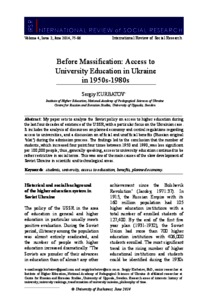 - Курбатов, Сергій (orcid.org/0000-0002-8929-7562) (2014) Before Massification: Access to University Education in Ukraine in 1950s-1980s International Review of Social Research, 2 (4). pp. 75-86. ISSN 2069-8534