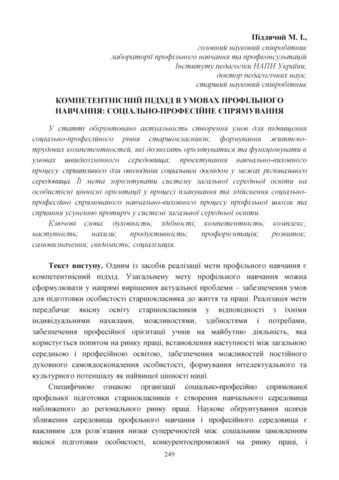 - Піддячий, Микола Іванович (orcid.org/0000-0001-6571-1450) (2014) Competence approach in terms of profile education: social and professional focus Компетентнісний підхід в освіті: теоретичні засади і практика реалізації: матеріали методол. семінару 3 квіт. 2014 р., м.Київ, 1. pp. 249-256.