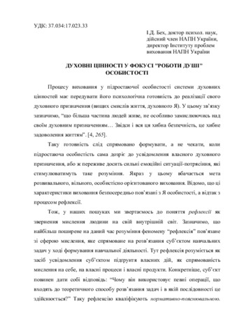 - Бех, І.Д. (orcid.org/0000-0002-4763-1673) (2011) Spiritual values in focus "of the soul" of the individual Педагогічний вісник, 3 (65). pp. 13-15.