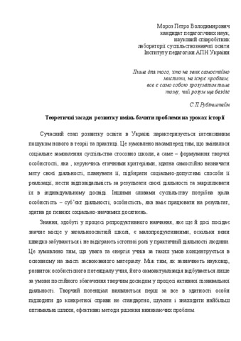 - Мороз, Петро Володимирович (2008) Теоретичні засади розвитку вмінь бачити проблеми на уроках історії Історія в школах України, 9. pp. 11-15.