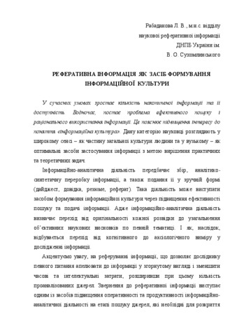 Consider the concept of "information culture". Been analyzed that appeal to abstract information is one of the means to improve the efficiency and performance of information-analytical activity at the stage of sourcing, which are necessary for the disclosure of the chosen subjects. Studied the category of "information overload" and "intoxication of information" in connection with the socio-political circumstances.