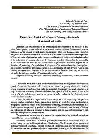 - Колісник-Гуменюк, Юлія Ігорівна (2014) Formation of spiritual values in future professionals of national art crafts British Journal of Science, Education and Culture, 1 (5). pp. 457-462. ISSN 0007-1657