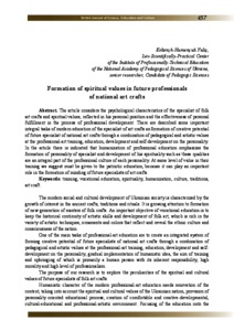 The article considers the psychological characteristics of the specialist of folk art crafts and spiritual values, reflected in his personal position and the effectiveness of personal fulfillment in the process of professional development. There are described some important integral tasks of modern education of the specialist of art crafts as formation of creative potential of future specialist of national art crafts through a combination of pedagogical and artistic values at the professional-art training, education, development and self-development of the personality. In the article there is indicated that humanization of professional education emphasizes the formation of personality of specialist and development of his spirituality such as these qualities are an integral part of the professional culture of each personality. At same level of value in their training we suggest must be given to the patriotic education, because it can play an important role in the formation of minding of future specialists of art crafts.