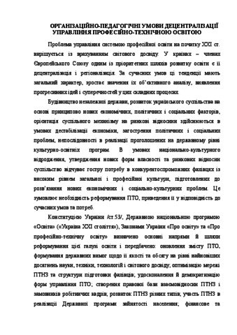 In the considered organizational, scientific, educational and economic foundations of vocational lit under decentralization. Theoretically, the necessity of simulation process management as VET sub "facility market economy under decentralization. The features of decision-making and implementation of VET directors, realities and prospects of social and educational conditions decentralization of VET.