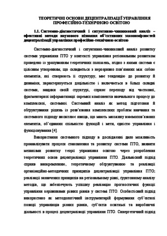 The systematic diagnostic and situational analysis chynnykovyy-effective methods of scientific knowledge about "the laws of objective decentralization of vocational education. Shows organizational and methodological principles of decentralized management and priority factors of management of VET under decentralization. The model governance of VET and the theoretical justification results of experimental verification pedagogical principles of decentralization of VET.