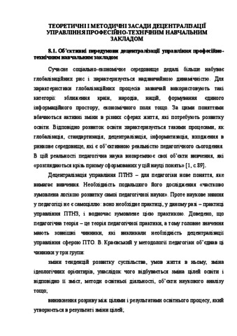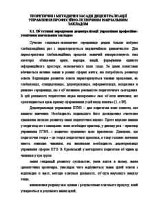 Reasonably objective prerequisites for decentralization of management vocational schools. Proved that the theoretical and methodological foundations of management decentralization should be formed with the influence of the functional tasks of regional management on the management development strategy of vocational school.