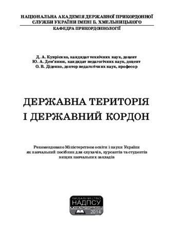 Купрієнко, Дмитро Анатолійович, Дем'янюк, Юрій Анатолійович and Діденко, Олександр Васильович (2014) State territory аnd the state border . НАДПСУ, м. Хмельницький, Україна. ISBN 978-966-8056-78-8