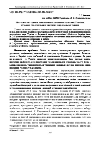 - Хемчян, Ірина Іванівна (2014) Scientific and Methodological Support for School Libraries in Ukraine Under the Conditions of Reforming the National Education System Наукові праці Державної науково-педагогічної бібліотеки України імені В. О. Сухомлинського. Вип. 4. Інтегрований галузевий інформаційний ресурс: стан, проблеми, перспективи створення та забезпечення доступу. pp. 343-352. ISSN 2409-0891