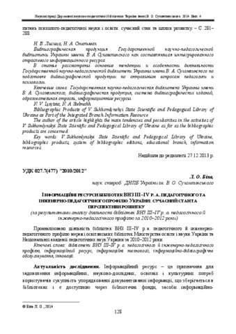 - Біла, Людмила Олексіївна (2014) Information Resources of the Libraries Belonging to the Pedagogical and Engineering-and-Pedagogical Higher Educational Establishments of the 3rd and 4th Levels of Accreditation in Ukraine Наукові праці Державної науково-педагогічної бібліотеки України імені В. О. Сухомлинського. Вип. 4. Інтегрований галузевий інформаційний ресурс: стан, проблеми, перспективи створення та забезпечення доступу: зб. наук. пр. pp. 128-138. ISSN 2409-0891