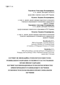 - Бородієнко, О.В. and Музичко, Л.В. (2015) Coaching as an innovative technology of personality developing education: pecularities of usage in professional training Молодий вчений, 2 (17). pp. 22-26. ISSN 2304-5809