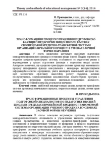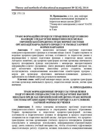 - Приходькіна, Н.О. (2014) Transformation of management of the professional training of educators in the european credit transfer system of educational process in the form distance learning Theory and methods of educational management, 3 (14).
