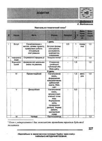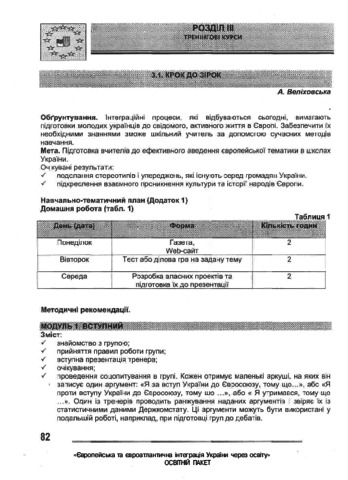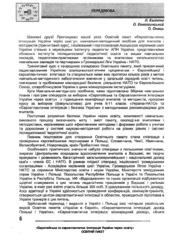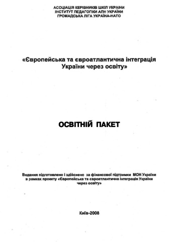 In an educational cluster «European and Euro-Atlantic Integration of Ukraine through Education» – educational and methodological manual, bases of pedagogical workers’ activity are reflected in relation to the questions of integration processes of Ukraine into European and Euro-Atlantic community. Basic regulatory documents on this issue are presented; peculiarities of preparation and realization of training lessons as one of the most effective forms of activity are exposed; particular learning aids of training lessons of scientists and practitioners and also additional materials and presentations are given in the educational and methodological manual. Content is built in the form of training aids for realization of lessons during professional development courses of pedagogical workers (as a special elective course) and realization of seminars-training for different categories of educationalists, local public agents etc.