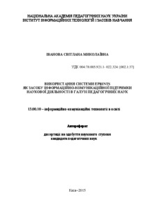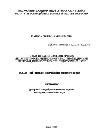The thesis is focused on the problems of the using of EPrints system as a mean for communication and information support of scientific activities in the field of pedagogical sciences. The nature of the concepts of “information and communication support for research activities”, “information and communication competence of scientific specialists” in the field of pedagogical sciences is clarified. The analysis of theoretical approaches to problems of communication and information support of scientific and pedagogical specialists in the field of pedagogical sciences is done; the model for communication and information support of scientific activity using of EРrints system developed and scientifically grounded, as well as the model of researchers’ information and communication competence development in the field of pedagogical sciences is built. The recommendations on EPrints system using in the scientific activities in the field of pedagogical sciences are elaborated. The results of the pedagogical experiment confirm outlined in the thesis hypothesis and are the basis for conclusion: experimental verification of the methodology of using of ЕРrints system as a tool for communication and information support for scientific activity is effective and can be implemented in the process of scientific activity in the field of pedagogical sciences.