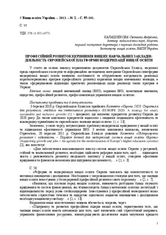 - Калашнікова, С.А. (2013) Professional development for heads of higher education institutions: activity of European Platform Higher Education Modernisation Вища освіта України, 2. pp. 95-101. ISSN 2078-1016