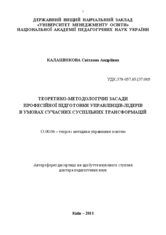 - Калашнікова, С.А. (2011) Теоретико-методологічні засади професійної підготовки управлінців-лідерів в умовах сучасних суспільних трансформацій Other thesis, ДВНЗ "Університет менеджменту освіти".
