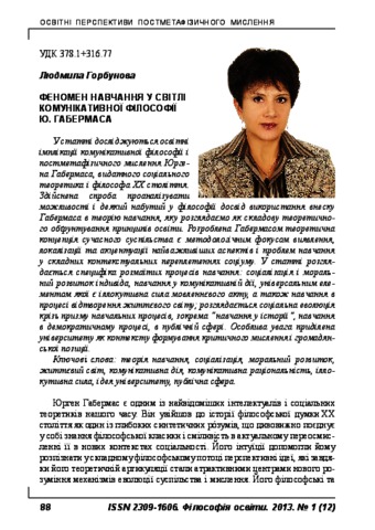 - Горбунова, Л.С. (2013) Феномен навчання у світлі комунікативної філософії Ю.Габермаса Філософія освіти, 1 (12). pp. 88-118. ISSN 2309-1606