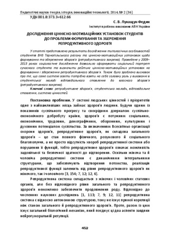 - Лукащук-Федик, С.В. (2014) The research of value-motivational attitudes of students to the problems of development and preserving reproductive health. Педагогічні науки: теорія, історія, інноваційні технології, 2 (36). pp. 452-463. ISSN 2312-5993