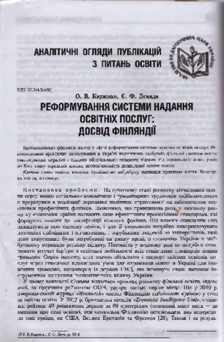 - Карпенко, О. В. and Демида, Є. Ф. (2014) Reformation of education service system in Finland Педагогіка і психологія. Вісник НАПН України, 1. pp. 88-98. ISSN 2304-06294