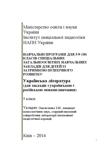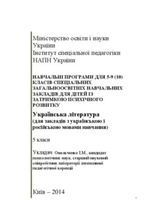 Зміст навчальної програми побудовано відповідно до вимог Державного стандарту базової і повної загальної середньої освіти та укладено на основі адаптації державних вимог до загальноосвітньої підготовки учнів із затримкою психічного розвитку. Упровадження навчальної програми забезпечить розширення можливостей розвитку мовленнєвої і читацької культури, комунікативної та літературної компетентності, гуманістичного світогляду в учнів 5 класів із затримкою психічного розвитку шляхом запровадження оновленого змісту курсу з «Української літератури». Для вчителів, які навчають дітей 5 класів спеціальних загальноосвітніх навчальних закладів для дітей із затримкою психічного розвитку.