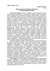 In the article there have been detalized military–patriotic program and applied horting as a system of complex type which provide: diverse educational activities, consolidation of knowledge in the Protection of Motherland subject, physical education, study of self-defense techniques and techniques of applied horting, medicine, geography, biology, fundamentals of health, practical skills for using them in daily lifestyle and in the extreme conditions; recommendation to parents about forms and methods of military–patriotic education of pupils in a family; running events and the use of methods by a coach for the purpose of successful educational work in the military-patriotic education of horting; viewing of documental films, analysis of the read materials. According to the program there have been established the objectives of military–patriotic education by the means of horting: mastering of fundamental skills of personal and collective security, providing of self and mutual help in extreme conditions, strengthening of moral and volitional powers and physical development of pupils, introduction with the rescue fundamentals, fundamental physical and special physical training to perform service in the units of the state security agencies – in the armed forces of Ukraine, units of the Ministry of Emergency Situations of Ukraine and the Ministry of Internal Affairs of Ukraine, education of environmental culture, active participation in the activity of horting organization in Ukraine and abroad. To check the effectiveness of theoretic part (program and tasks) there have been systematically giving the lessons in different forms: theoretic lessons of different educational directions; horting trainings and applied horting trainings; trips, visits to historical places and places of the Cossacks glory; participation in competitions. The author has made a number of interpretations: „physical training in applied horting“, „applied physical training in horting“, „special physical training performed by the pupils of horting during military – applied lessons“, „military moral (by the educational philosophy of horting)“, „ethnic combat traditions of the Zaporozhian Sich“ etc.