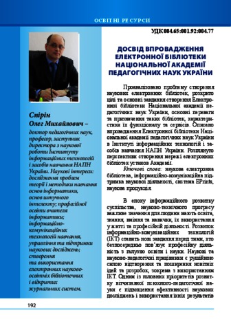 - Спірін, О.М. (orcid.org/0000-0002-9594-6602) and Іванова, С.М. (2015) Experience of digital library Academy of pedagogical sciences Ukraine Ukrainian pedagogical journal, 1. pp. 192-205. ISSN 2411-7420 (Online)