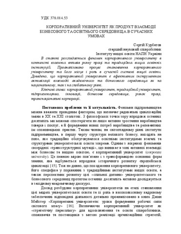 - Курбатов, Сергій (orcid.org/0000-0002-8929-7562) (2014) Corporate University as a Contemporary Product of Interaction in Business and Educational Environments Вища освіта України, 3 (54). pp. 44-49.