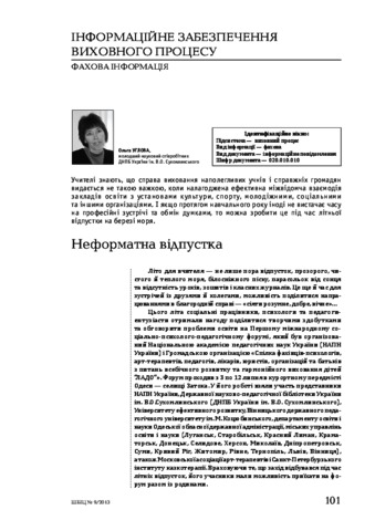 - Углова, Ольга Віталіївна (2013) Unusual Vacation Шкільний бібліотечно-інформаційний центр, 9 (35). pp. 101-104.