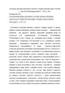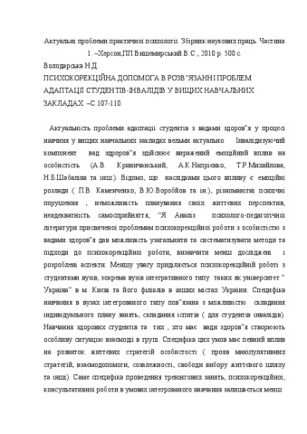 - Володарська, Наталія Дмитрівна (2010) Psycho correction help in solving the problems of adaptation of students with disabilities in higher education Актуальні проблеми практичної психології. pp. 107-110.