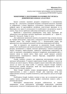 - Шиненко, М.А. (2013) Monitoring electronic research resources with Google Analytics In: Звітна наукова конференція Інституту інформаційних технологій і засобів навчання НАПН України . ІІТЗН НАПН України, м.Київ, Україна, pp. 111-112.