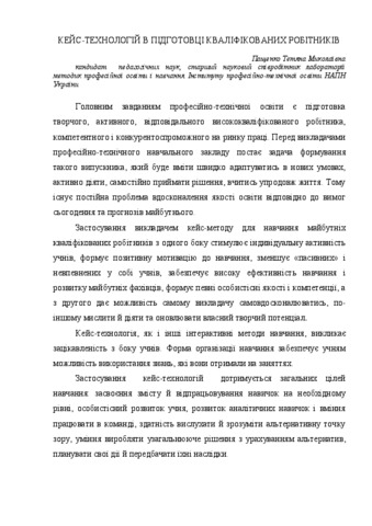 - Пащенко, Т.М. (2014) Case technologies in training skilled workers In: Всеукраїнська інтернет-конференція «Педагогічна майстерність викладача у системі професійної освіти» 27.05.2014р. Особистісно-розвивальні педагогічні технології . Професійно-педагогічний коледж імені О.Довженка, м.Глухів, Україна, pp. 8-10.