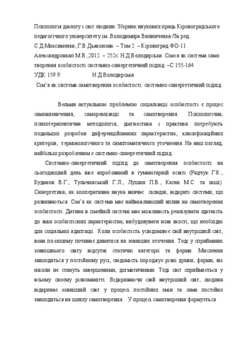 - Володарська, Наталія Дмитрівна (2012) The family as a system of self-creation of personality, systematic and synergetic approach Психологія діалогу і світ людини. Збірник наукових праць Кіровоградського педагогічного університету ім.Володимира Винниченка (2). pp. 155-164. ISSN 978-966-2466-19-5