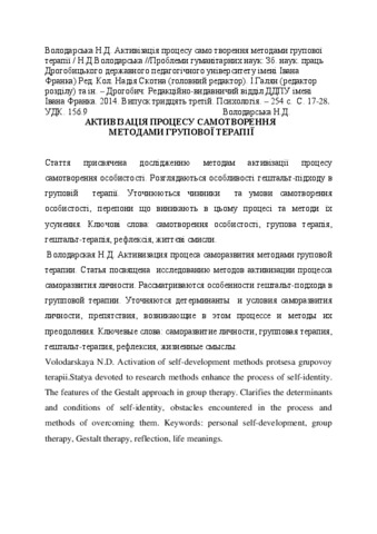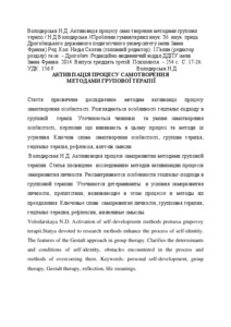 - Володарська, Наталія Дмитрівна (2014) Activization of processes of self-creation with a method of group therapy Проблеми гуманітарних наук: Зб. наук. праць Дрогобицького державного педагогічного університету імені Івана Франка, 33. pp. 17-28. ISSN 2312-8437