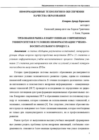 - Кочарян, Артур Борисович (2014) The requirements market to graduates of universities in conditions of informatization of the educational process Инновационные тенденции развития системы образования: материалы II междунар. науч.–практ. конф. (Чебоксары, 13 июня 2014 г.). ISSN 978-5-906626-28-8