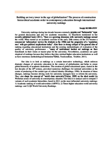 University rankings during last decade became extremely popular and “fashionable” topic for general discussions and also for academic researches. As Hazelkorn mentioned in her recently published book (2011), “there is a growing obsession with university rankings around the world. What started as an academic exercise in the early 20th century in the US became a commercial ‘information’ service for students in the 1980s and the progenitor of a ‘reputation race’ with geo-political implications today”. Also there is strong critique of the general idea of ranking regarding educational institutions and the existing methodologies of evaluation of the quality of university performance - “many of institutional leaders set rankings as their benchmark in their vision or master plan for the university. Nevertheless, academics are quite skeptical of rankings because they believe that they mislead higher education institutions as well as have enormous methodological limitations”(Shin, Toutkoushian, Teichler, 2011). Our idea is to look at rankings as a certain innovative technology, which enforces dramatic changes of university education in the context of globalization and helps to create global hierarchy of academic institutions. The creation of global educational space, started in the last decades of the 20th century, provoked numerous challenges for national universities as the centre of producing of the certain type of cultural identity (Readings, 1996). In situation of these changes, rankings become driving tools for university managers how to reform the university. They also shape the concept of “world class university”(Salmi, 2009) as the ideal model (in Weberian sense) of university in contemporary situation. Our idea is to analyze and to compare 3 variants of such academic hierarchies, based in 2011 on the most influential university rankings: 1) Academic ranking of world universities (ARWU); 2) Times higher education world university rankings and 3) QS World University Rankings.