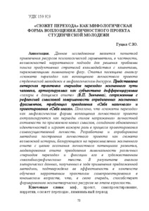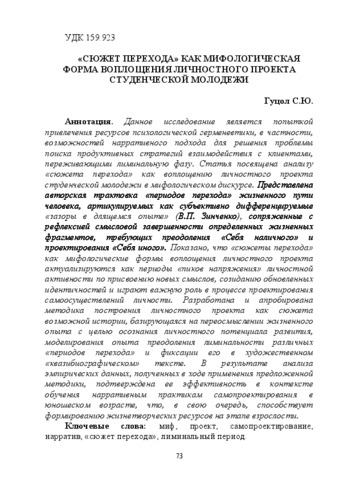This study is an attempt to involve psychological hermeneutics resources, in particular the capacity of the narrative approach to solve the problem of a search for efficient strategies to interact with the customers, which experience the liminal phase. The article analyzes the "plot of transition" as implementation of the personal project of students in the mythological discourse. The author presents her interpretation of the "periods of transition" of a human’s life path, articulated as subjectively differentiated "gaps in the lasting experience" (V.P. Zinchenko) and associated with reflection of semantic completion of certain life’s fragments, which require overcoming of "Oneself as a present one" and designing of "Oneself as another one". It is shown that "plots of transition" as mythological forms of implementation of the personal design are updated as periods of "surges" of personal activity to assign new meanings, to create renewed identities. "Plots of transition" play an important role in the process of designing of an individual’s self-realizations. The author elaborated and tested the technique of construction of the personal design as a possible story’s plot. This technique is based on reinterpretation of one’s life experience with the purpose to realize a personal’s development potential, to model the experience, which overcomes the liminality of various "transition periods", and to fix this experience in a fictional "semi-biographical" text. As a result of analysis of empirical data obtained from the application of the proposed technique, the latter has been confirmed as efficient in the context of studying of self-designing narrative practices in the age of adolescence, which in turn promotes the formation of life-creative resources in the adulthood’s phase.