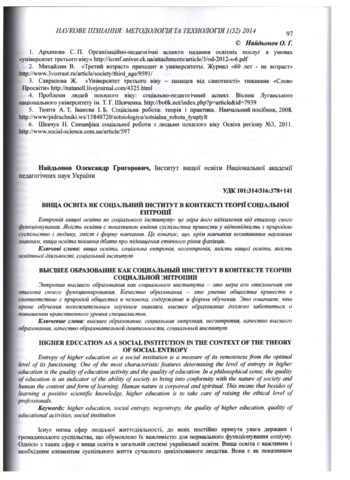 - Найдьонов, Олександр Григорович (2014) Higher Education as a Social Institution in the Context of the Theory of Social Entropy Наукове пізнання: методологія та технологія, 1 (32). pp. 97-102. ISSN 1561-1264