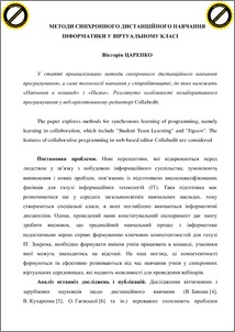 - Царенко, В.О. (2013) Методи синхронного дистанційного навчання інформатики у віртуальному класі Наукові записки. Серія: педагогічні науки (100). ISSN 978-966-7406-57-8