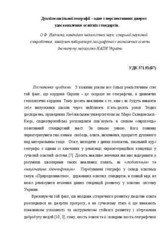 - Надтока, О. Ф. (2011) Dualism in school geography – one of the most promising sources of improving educational standards Педагогіка вищої та середньої школи (33). pp. 363-368. ISSN 2304-4470