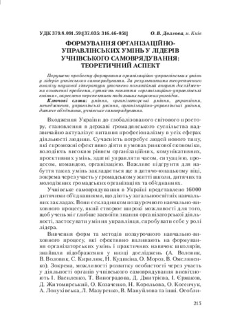 - Долгова, Олександра Валеріївна (2014) Formation of Organizational and Managerial Skills of Student Self-Government Leaders: A Theoretical aspect Теоретико-методичні проблеми виховання дітей та учнівської молоді, 1 (18). pp. 215-222.