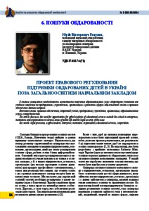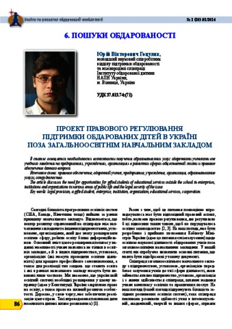 - Гоцуляк, Юрій Вікторович (2014) The project of legal regulation the support of gifted children in Ukraine out a comprehensive educational institution Education and Development of Gifted personality, 1 (20). pp. 86-88. ISSN 2309-3935